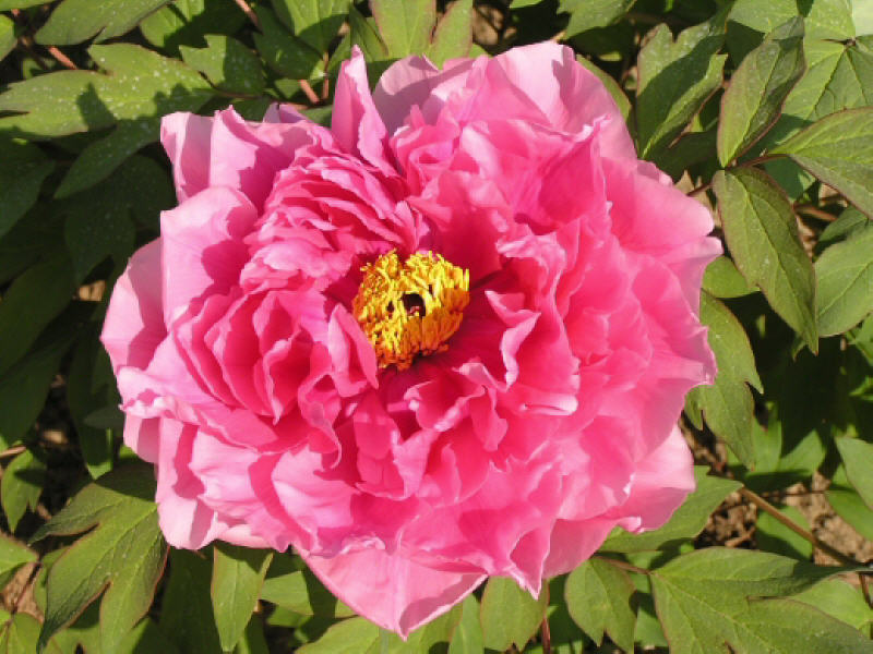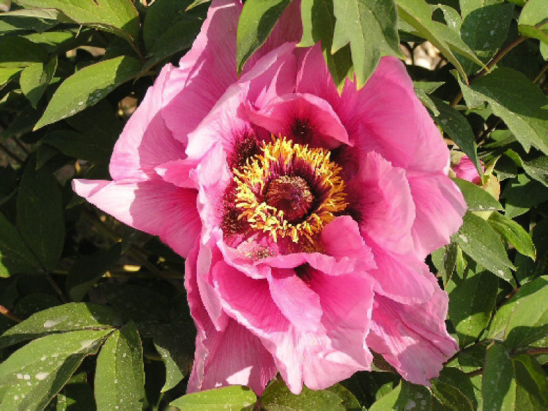 Sortenname: Kui Hua Hong Blütenfarbe: rubin rosa Wuchshöhe: 1,2 - 1,5 m Blütengröße: China Original: 15 cm Bestell.Nr.: Suf.20990 Blütenform: halbgefüllt Wuchsstärke schmal, langsam Blütezeit: mitte - spät Besonderheit: gelb grünes Laub